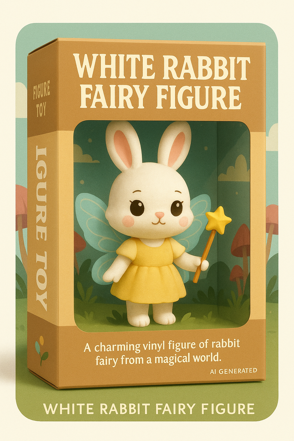 "A packaging design image of a cute white rabbit fairy figure, pastel colors, fantasy style, toy box with transparent window, magical world background, charming vinyl figure, soft lighting, professional product photo."